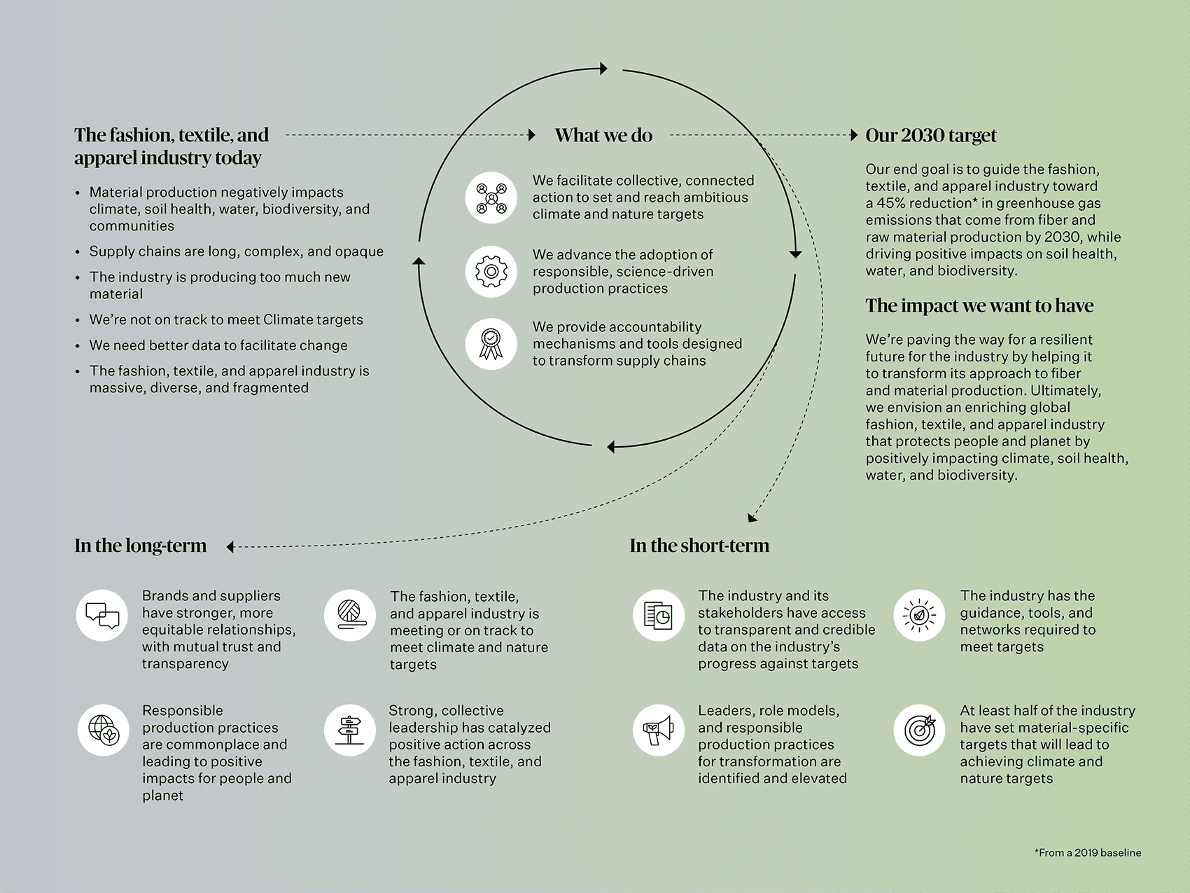 At the heart of our strategy is the goal of helping the fashion, textile, and apparel industry to reduce the greenhouse gas emissions that come from fiber and raw material production by 2030. We call it Climate+.