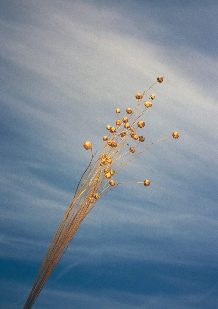 Each photograph aims to capture the scent, mood, and sensuality of flax production. I try to seize the immediacy of moments, preserving the experience. Dry flax stems and soft fibers are compared with other textures and forms, as well as people seen and met locally.